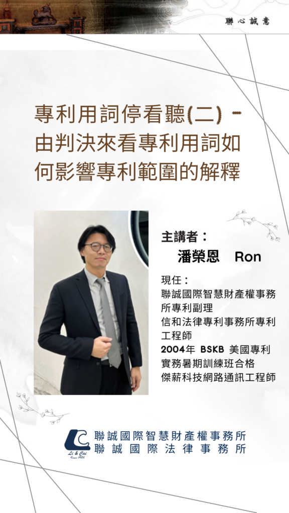 聯誠國際智慧財產權事務所秉持「專業、前瞻、分享」的理念,持續為客戶提供智慧財產權最新趨勢與專業資訊。因此,我們不定期舉辦研討會,分享智慧財產權實務經驗,協助客戶強化智慧財產權保護。2025年10月31日(五)14:30-16:30假本所教育訓練室,舉辦「專利用語停看聽(二) 用判決來看專利用語如何影響專利範圍的解釋」研討會,由本所潘榮恩Ron專利副理主講。茲將本次研討會重點摘要如下: